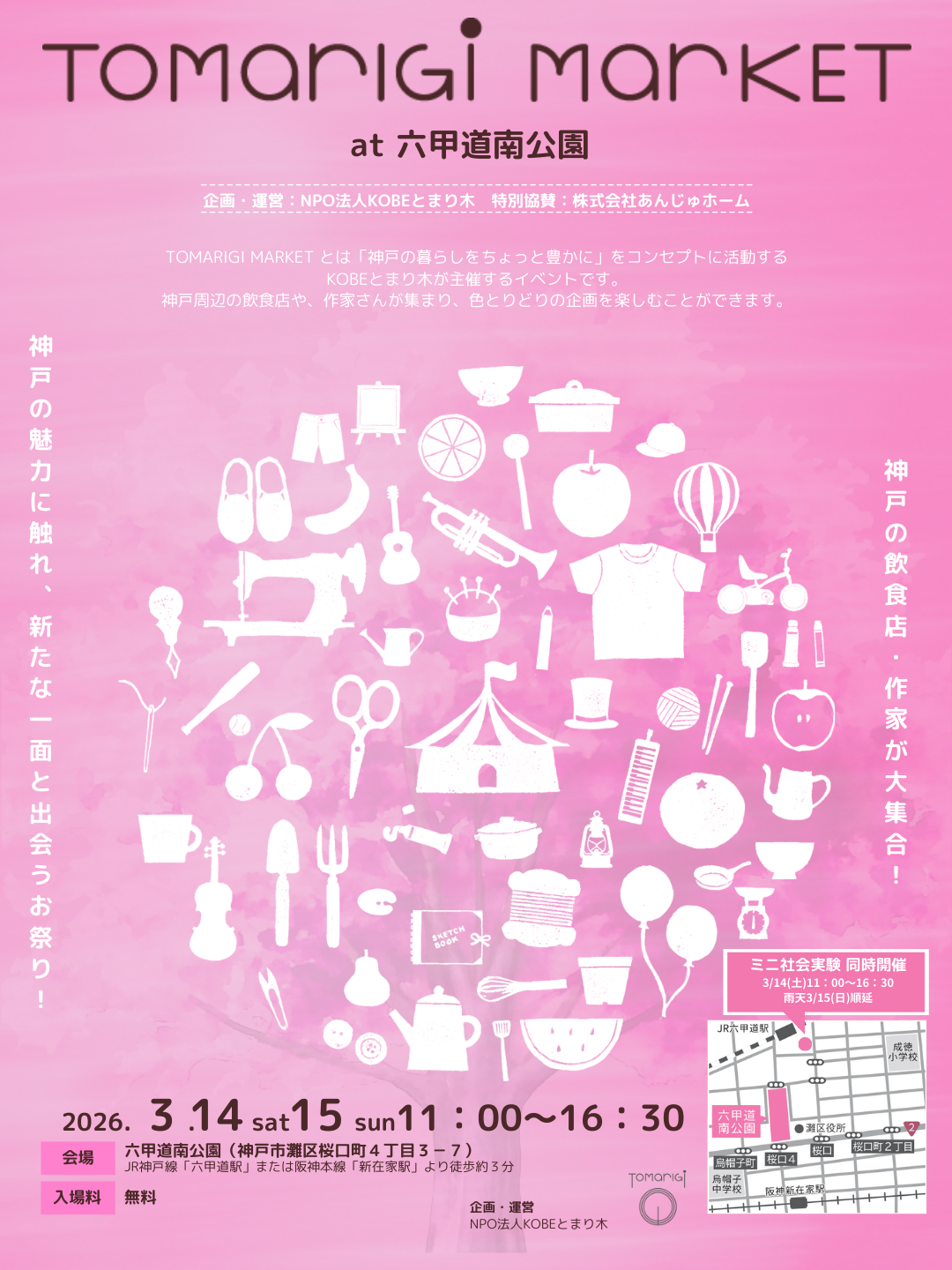 NPO法人KOBEとまり木が主催する「TOMARIGI MARKET at 六甲道南公園」が、2026年3月14日(土)・15日(日)の2日間、六甲道南公園で開催されます♪