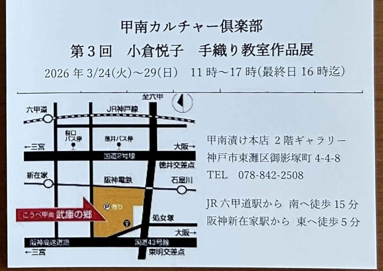 御影の甲南漬け本店2階ギャラリーで、手作りならではの温かさがあふれる展示会が開催されます!甲南カルチャー倶楽部「第3回 小倉悦子 手織り教室作品展」、通称「おり・おり・織展」が、2026年3月24日(火)~29日(日)までの6日間、いよいよ開幕します♪